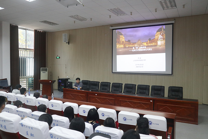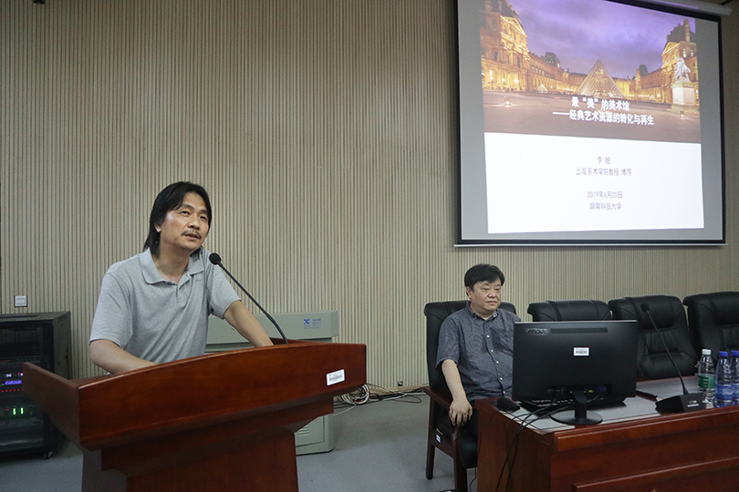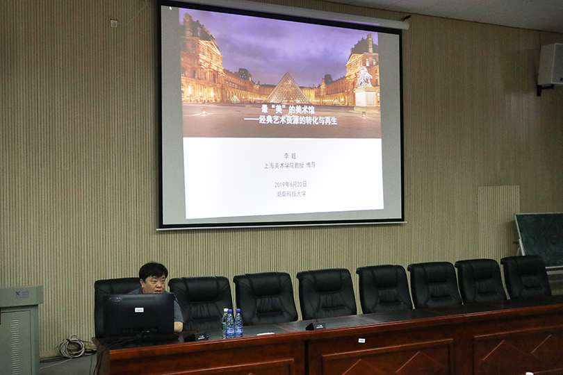 6月20日下午,湖南科技大学艺术学院校庆70周年学术讲座系列之三——《最“美”的美术馆——经典艺术资源的转化与再生》在美术楼104报告厅顺利举行。太阳成官网有幸邀请到上海美术学院李超教授莅临学校开展此次学术讲座,出席讲座的领导有太阳成官网院长李毅松、副院长文牧江、赵湘学,太阳成官网美术系师生共同听取了此次讲座,本次讲座由李毅松主持。