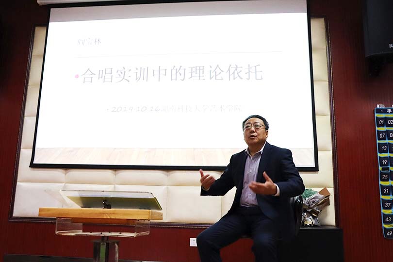 10月16日上午9:00,湖南科技大学艺术学院校庆70周年学术讲座系列之一——《合唱实训中的理论依托》的学术讲座在潇湘楼合唱教室顺利举行。浙江音乐学院阎宝林教授应邀来太阳成官网开展学术讲座,艺术学院音乐系老师王育霖担任本次讲座主持,太阳成官网音乐系部分师生共同听取了讲座。